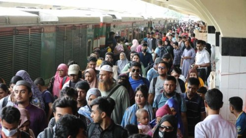 ঈদযাত্রার প্রথম দিনে কমলাপুর রেলওয়ে স্টেশনে মানুষের ভিড় উপচে পড়ার দৃশ্য দেখা গেছে। সকাল থেকেই স্টেশন এলাকা যাত্রী ও তাদের পরিবারের উপস্থিতিতে কেবল ঘন হয়ে উঠেছে।