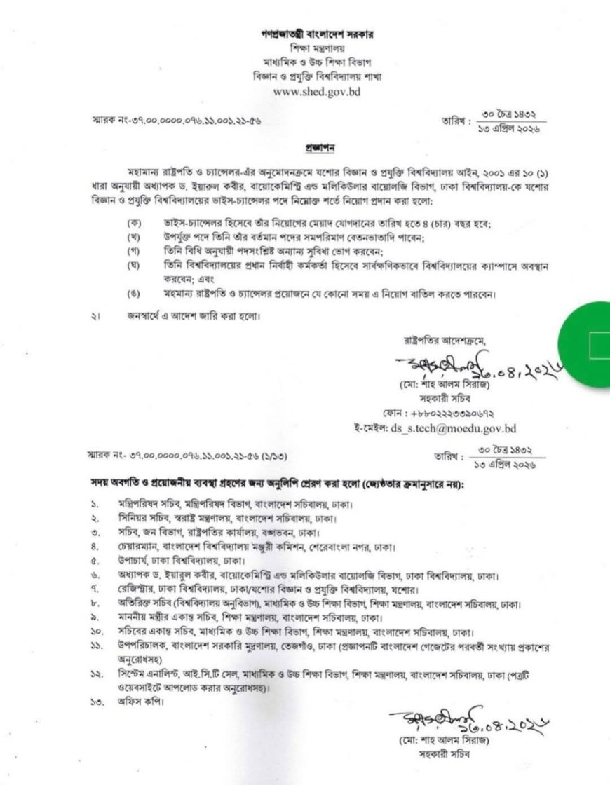 যশোর বিজ্ঞান ও প্রযুক্তি বিশ্ববিদ্যালয় (যবিপ্রবি) ভিসি হিসেবে যোগদান করেছেন অধ্যাপক ডঃ ইয়ারুল কবীর। গতকাল সোমবার শিক্ষা মন্ত্রনালয়ের মাধ্যমিক ও উচ্চ শিক্ষা বিভাগের বিজ্ঞান ও প্রযুক্তি বিশ্ববিদ্যালয় শাখার সহকারী সচিব মো: শাহ আলম সিরাজ স্বাক্ষরিত এক প্রজ্ঞাপনে এই আদেশ প্রদান করা হয়েছে। প্রজ্ঞাপনে বলা হয়েছে, মহামান্য রাষ্ট্রপতি ও চ্যান্সেলর-এঁর অনুমোদনক্রমে যশোর বিজ্ঞান ও প্রযুক্তি বিশ্ববিদ্যালয় আইন,২০০১ এর ১০(১) ধারা অনুযায়ী ঢাকা বিশ্ববিদ্যালয়ের বায়োকেমিস্ট্রি এন্ড মলিকুলার বায়োলজি বিভাগের অধ্যাপক ডঃ ইয়ারুল কবীর কে যশোর বিজ্ঞান ও প্রযুক্তি বিশ্ববিদ্যালয় এর ভাইস চ্যান্সেলর (ভিসি) পদে ৪ বছরের জন্য নিয়োগ প্রদান করা হলো।